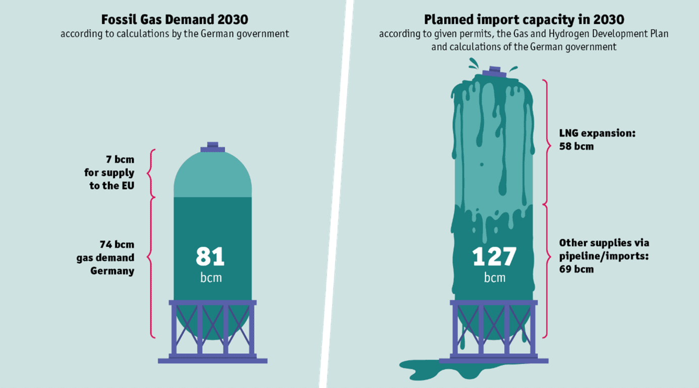 Für 2030 liegt der Erdgasbedarf nach Angaben der Bundesregierung bei 74,1 Mrd. m³. Wenn alle LNG-Projekte jedoch wie geplant umgesetzt werden, hätte Deutschland im Jahr 2030 eine Überkapazität von über 50 Mrd. m³.